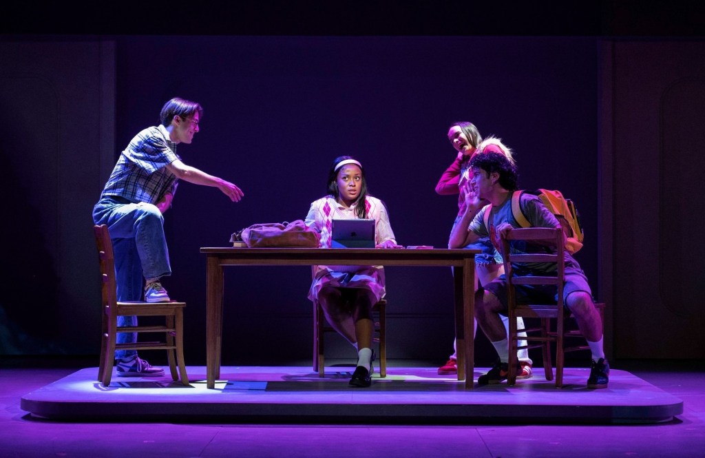 The use of direct address is inconsistent and ineffectively introduced. (And perhaps unnecessary.) The final moment, deconstructing the set, exposing the band, breaking the fourth wall, and revealing the musical to be a musical, is pretentious and unearned. One wonders why Malaya does not make her first appearance when running into Noelle, rather than literally wandering across the stage in the moments prior. Two mobile locker units completely obliterate the pair’s meet-cute. An airplane interlude is ridiculous. A scene in the principal’s office is senseless. A couple of song entrances are telegraphed. “Legendary” is a mess. “Political Party” is a mess, despite a clever title line. And “Malaya’s Words” is a literal mess, leaving the stage littered, for no good reason, with dozens of white pages – which the company must hastily collect during the subsequent dimout. (Really?)