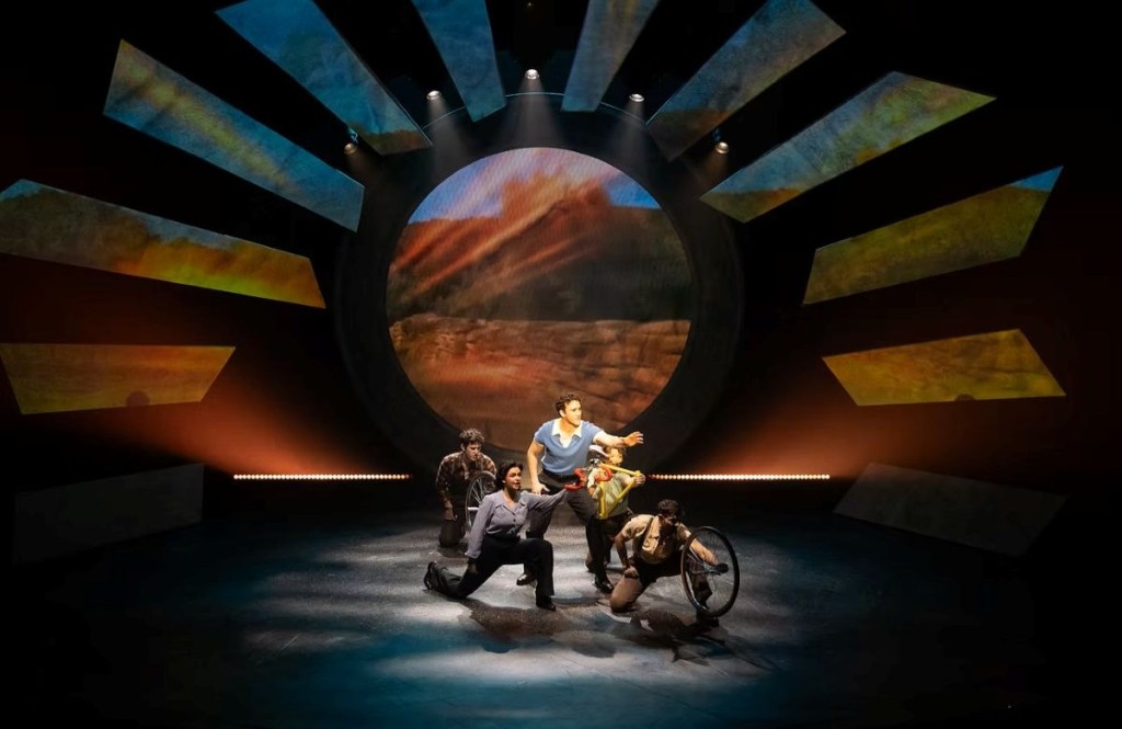 The laugh lines are stale. The business about a neon sign disappears. The decision about the town’s Dark Sky Reserve status is a foregone conclusion. The series of eleventh-hour incidents, including a sign busting, a trip to jail, a breakup, a kiss, a departure, a badge stripping, and a badge restoration, are alternately disorderly and manufactured. The love triangle is imbalanced. The principal characters are not finely etched, due in part to the deficiencies of song. The staging is generic, with no particular approach or point of view. And the moment in which the sky supposedly comes alive, on the upstage cyc, is anticlimactic, because the sky has been alive since practically the start of the show.
