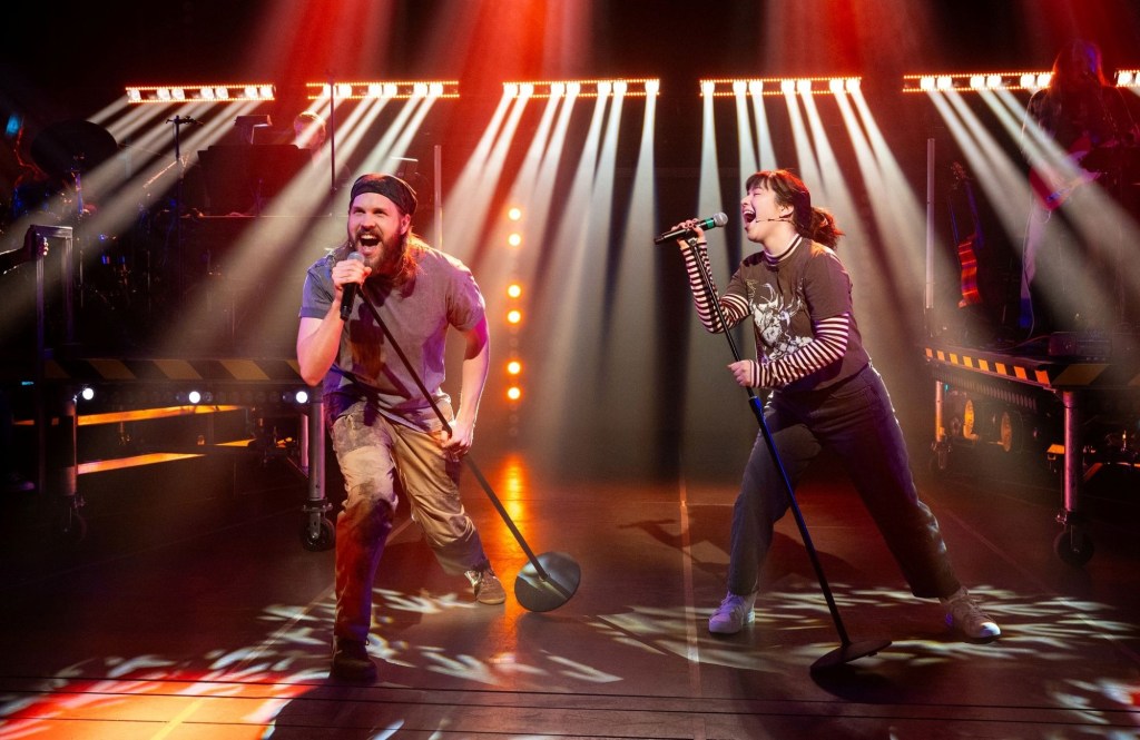The excellent unit set, by Arnulfo Maldonado, consists of two neighboring band platforms that split center and slide in and out, four vertical panels that slide in and out, a pair of upstage doors that slide open and closed, a pair of small ventilation fans burrowed into the upper regions of the back wall, and an elevated bridge that runs along the center of the back wall, with two ladders reaching down to the deck. Black-and-yellow safety strips and other-worldly lighting equipment adorn the tastefully appointed laboratory, which carries suggestions of a time machine. The lighting, by Jason Lyons, is incredibly elaborate, but it is neither ostentatious nor excessive. It is specific and purposeful and steeped in story, and it is, as such, truly remarkable, superb. The costumes, by Shahrzad Mazaheri, are acceptable. And the sound design, by Eric Norris, is especially fine, disregarding the use of concert-mic headgear. The balance between actors and musicians is on point, with audible lyrics, and the volume level is not deafening. Plus, the atmospheric effects, like the clanking of silverware in a diner, are a nice touch.