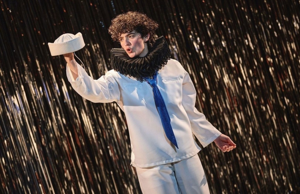 To be clear, I do not, as a rule, read program notes, curated interviews, or curated essays, and certainly not before the respective performance, but I was compelled to read the program note, by Cramer, the interview, by Sinha, and the essays, by Greenfield and playwright Alex Lin, associated with No Singing in the Navy, after the performance, and they are just as infuriating, just as embarrassing as the musical itself: unfettered foolishness, of the unfunny and destructive sort. What, for instance, is “the Golden Age style?” And did “glossy polish,” “glitz and glamor,” “flashing lights,” “spectacle,” “orchestra swells,” and “pristine precision” not exist on the musical stage prior to Greenfield’s “Golden Age” start date of 1943? Or, for that matter, after Greenfield’s “Golden Age” end date of 1963? And was the “Golden Age” really the time when the theatre was part of popular culture? Was the theatre not at or near the apex of popular culture in, for instance, the early 20th century, and did it not, at that time, almost directly overlap with the popular song?